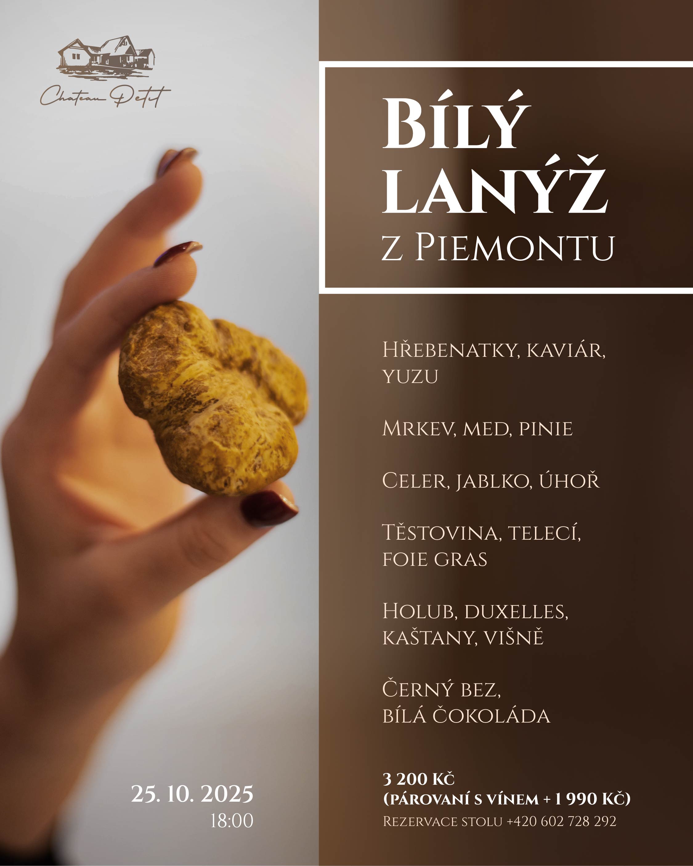Během této jedinečné události se můžete těšit na lahodné pokrmy, jejichž chuť pozvednou exkluzivní bílé lanýže. Každý chod bude harmonicky spojen s pečlivě vybranými italskými víny, která umocní zážitek z dokonalého propojení chutí a vůní. Po večeru plném gurmánských specialit na vás čeká odpočinek v našem hotelu, kde vám poskytneme veškerý komfort a péči.